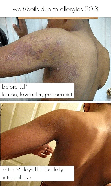 Often, allergies will manifest themselves through the skin. As you can see in the photo above, Cy had almost immediate results with the LLP Antihistamine Blend {lavender, lemon, and peppermint} internal protocol. His welts were healing, his adrenals calmed, and he was able to sleep again.